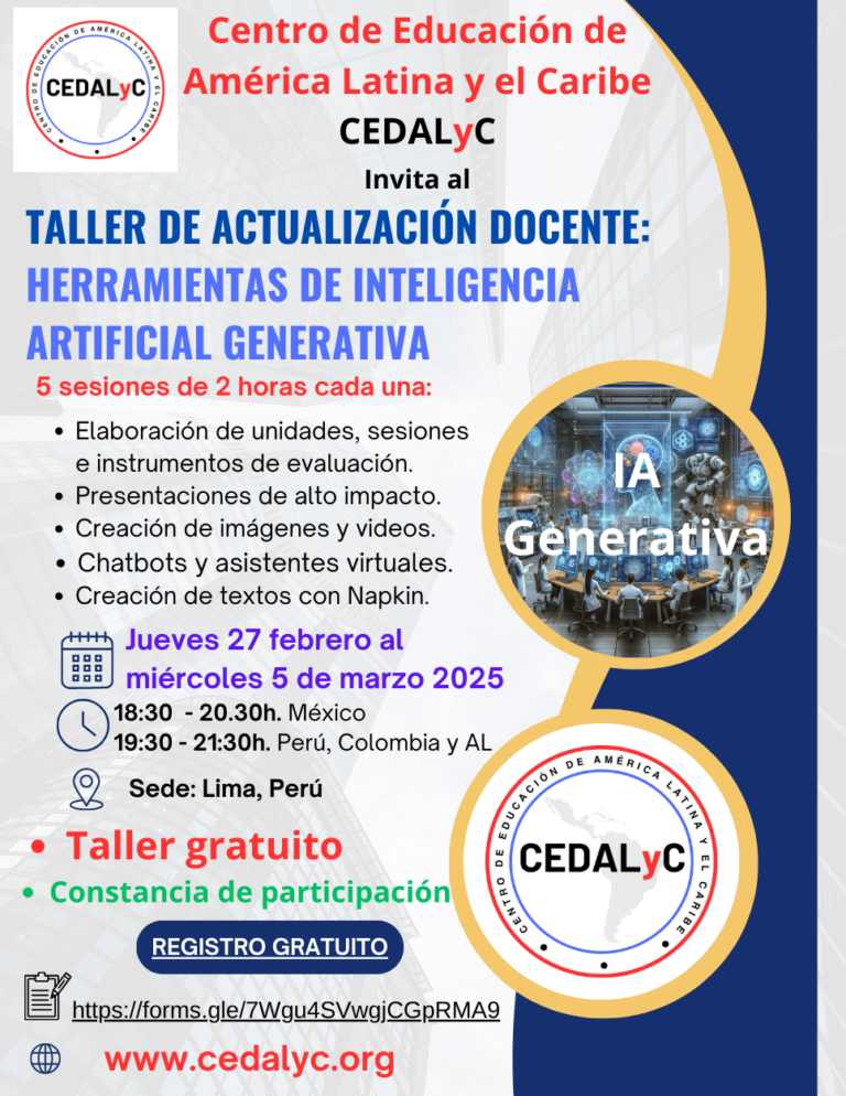 El Centro de Educación de América Latina y el Caribe, invita a inscribirse al taller de actualización docente: Herramientas de inteligencia artificial generativa. Duración: 27 de febrero al 5 de marzo de 2025. 5 sesiones de 2 horas