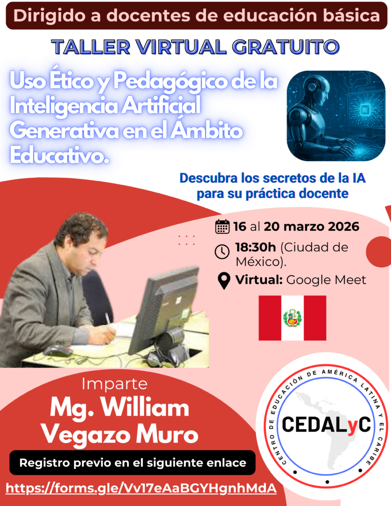 La evaluación será formativa y se realizará a través de: – Participación activa en los talleres. – Desarrollo de actividades prácticas. – Producto final: diseño de una actividad o sesión de aprendizaje que integre IA generativa de manera ética y citada correctamente.